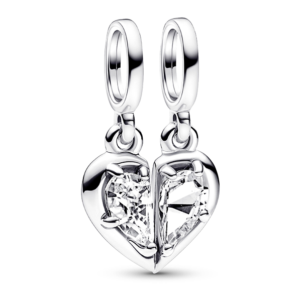 New pieces from the collections have been carefully hand-crafted to explore stories of motherly love. A metaphor for motherly protection, an elegant sterling silver double dangle charm displays a cut-out heart lined with white bioresin man-made mother of pearl pavé along its edges. An innovative new technique which results in pieces that are the ultimate eye-catcher.